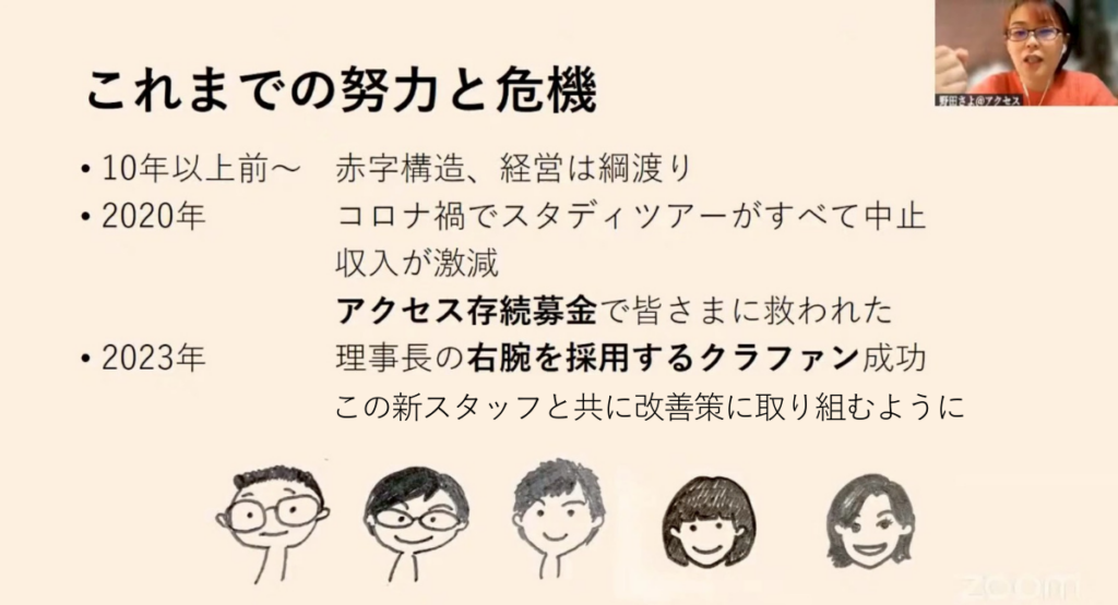 2020年、コロナ禍でスタディツアーがすべて中止になり、収入が激減。このときは「アクセス存続募金」で700万円以上の寄付が集まり、皆さまの力で危機を乗り越えさせていただきました。