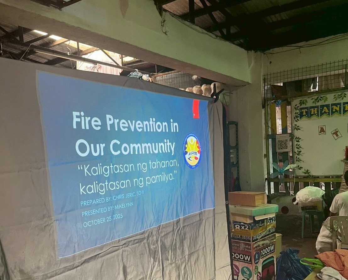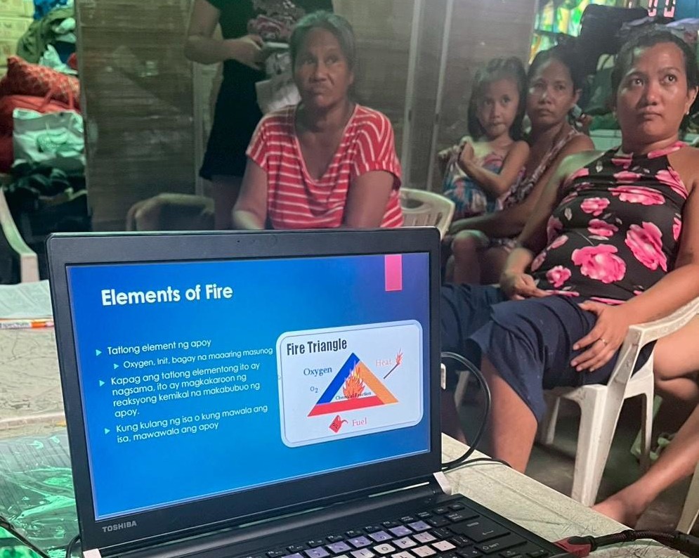 後半の火災防止講座では、8月、9月と連続で発生したトンド地区での火災被害を踏まえ、再発を防ぐための知識を共有。主な内容として、電子機器からの発火が主な火災の原因として挙げられる為、延長コードの扱い方や、就寝・外出時に電源を抜くことの重要性など、身近な予防策を学びました。また、子どもが火で遊ばないように気をつける事であったり、コミュニティとして火災防止を努める事も重要です。
