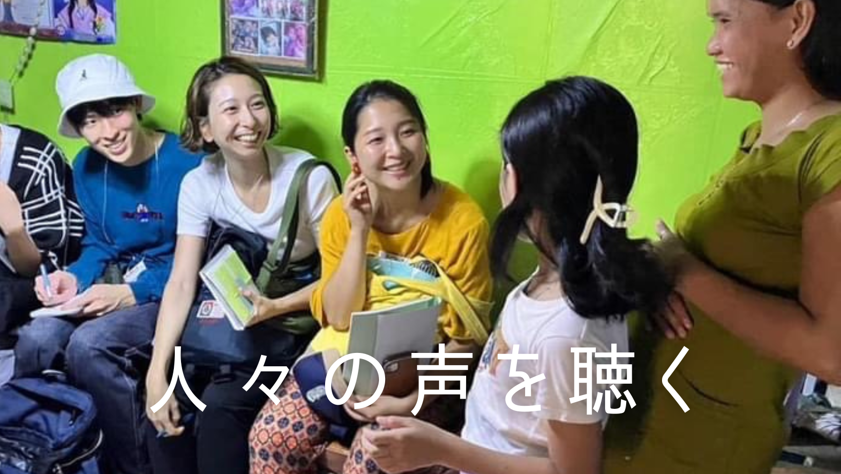都市スラムのご家庭をグループで訪問し、通訳付きで60分間インタビュー。心を開いてもらえるよう工夫しながらお話を伺い、人々の声に耳を傾けます。